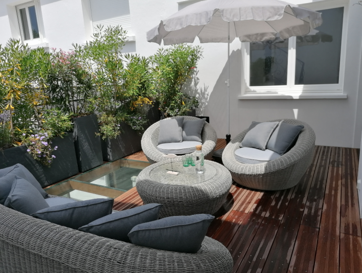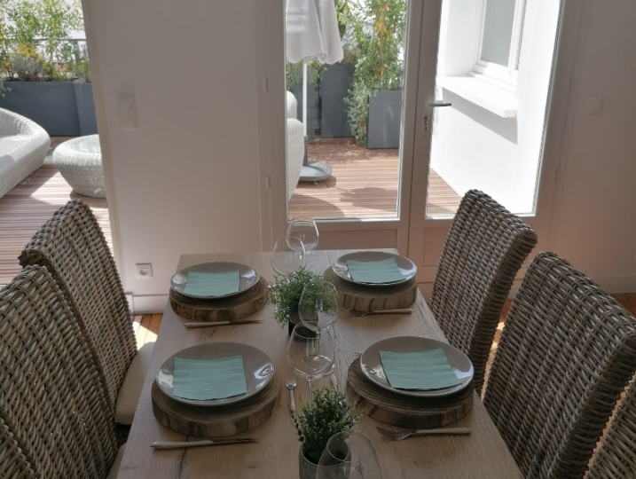 Superbe appartement meublé classé 5 étoiles de 100m². Grand séjour avec salon et TV, cuisine ouverte neuve toute équipée, coin bureau et table repas donnant sur la terrasse de 25m² comportant salon extérieur, bains de soleil et plancha électrique. 3 chambres ayant chacune leur propre salle d’eau avec douche sont disponible. 3 WC sont aussi à disposition. L’appartement est aussi équipé de la WiFi et d’une climatisation réversible.
